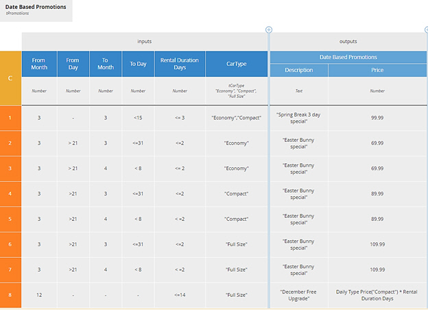 Finally, let’s look at Applicable Promotions. EU-Rent has a list of Date Based Promotions, here modeled as a BKM decision table. When a BKM is a decision table, the table inputs specify its parameters, so there are 6 of them. The table has 2 output columns, meaning a structure with 2 components, and the table has hit policy C (Collect), meaning return a list of outputs for each matching rule. So what is returned is a list of 2-column structures, the table type tPromotions. Also note that not all outputs are specified as literal values. In the last item in Date Based Promotions, the Price component of the output is an expression calling the BKM Daily Type Price.