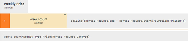 Weeks count subtracts the rental start date/time from the end date/time, giving a days and time duration. We divide that duration by the duration 168 hours (7 days x 24 hours), to get the number of weeks, and round that up to the next higher integer using the ceiling built-in function.