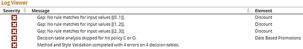 Once you’ve completed a decision model you need to validate it. On the DMN ribbon select Validate. That should return no errors. A second form of validation on that ribbon is Method & Style Decision Table Analysis, which looks for gaps, overlaps, and other errors in decision tables. In this model, that validation returns 3 errors on the Discount decision table in Discount Percent.From the table you can see the reason. Qualifying Rentals Count is really an integer, but FEEL has no integer type, only number. So the reported rule gaps are for intervals like greater than 0 but smaller than 1, impossible for integers. In a case like this you have two choices: (1) Understand the validation error and just accept it; or (2) Fix the table, even though that looks odd. The fixed table is shown below: