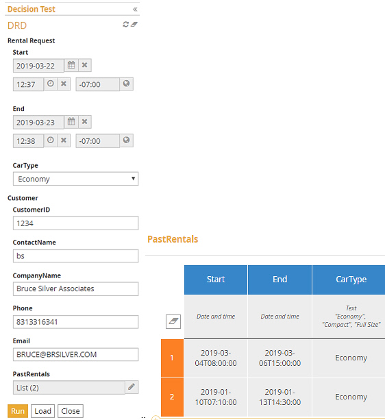 Now it’s time to execute the model. I don’t think I can emphasize this enough: If you cannot execute your model (and make sense of the results), you can’t have confidence that the logic is correct. Many DMN tools cannot execute the logic. Fortunately, Trisotech can.In the Execution ribbon, select Test. On the left, you enter values for the input data, then click Run. The tool reports outputs of all decision nodes in the DRD. After a run, Save preserves the input and output values in a Test Case. When entering values in the Test panel, the Load button lets you populate the form with values from a saved Test Case. The screenshots below show the input data for Test Case 2, followed by the execution output.