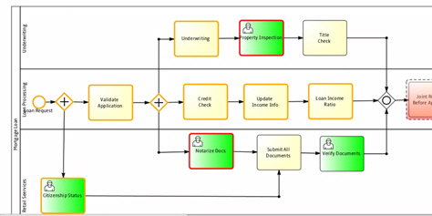 Vishal Saxena, formerly lead BPMS developer at Oracle and Intalio and a member of the BPMN 2.0 technical committee in OMG, today showed me a demo from his new company Roubroo. The interesting thing to me about Roubroo is the ease of modifying process definitions at runtime, either on a single instance or a set of instances, while strictly observing the semantics and rules of BPMN 2.0. Difficulty with ad-hoc behavior is one of the biggest objections some users have about BPMN 2.0. You shouldn't really have to give up ad-hoc processes to use BPMN 2.0 (or vice versa), and Roubroo is a good example of how to marry the two. Consider the diagram below of a loan origination process. (Note: I would call the merge of parallel flows into Submit All Documents incorrect, a 'multimerge', but Vishal claims a join is implied. We can agree to disagree on that; it is not that important to my point.)