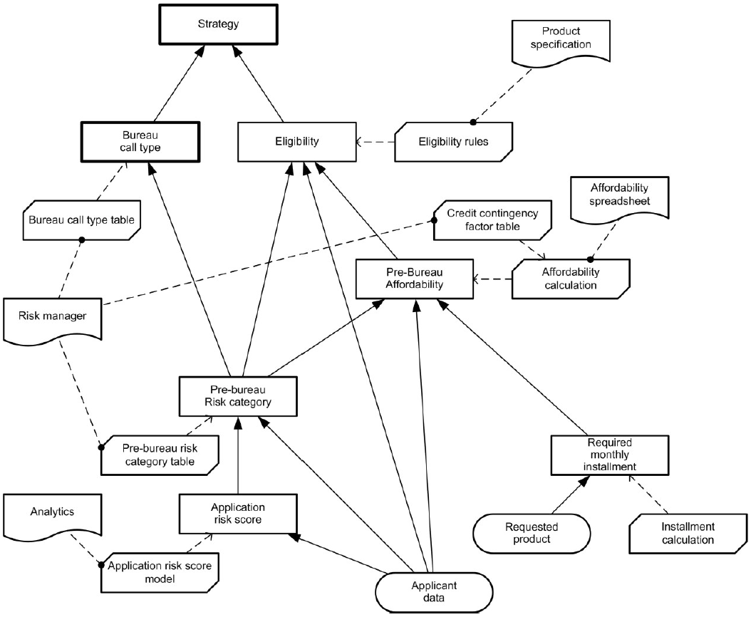 Reusable bits of decision logic may be displayed in the DRD in the form of business knowledge models (BKMs - rectangle with clipped corners), which are called by a decision using input values for a particular instance. The DRD also can link a decision or BKM to knowledge sources (wavy-bottom shape), model annotations representing the “authority” behind the decision logic, such as policies, business rules, or analytical models. Thus in a simple diagram, DMN can depict all of the variables and authorities behind a complex business decision. BRMS-specific decision modeling tools typically cannot do that, nor can TDM.
