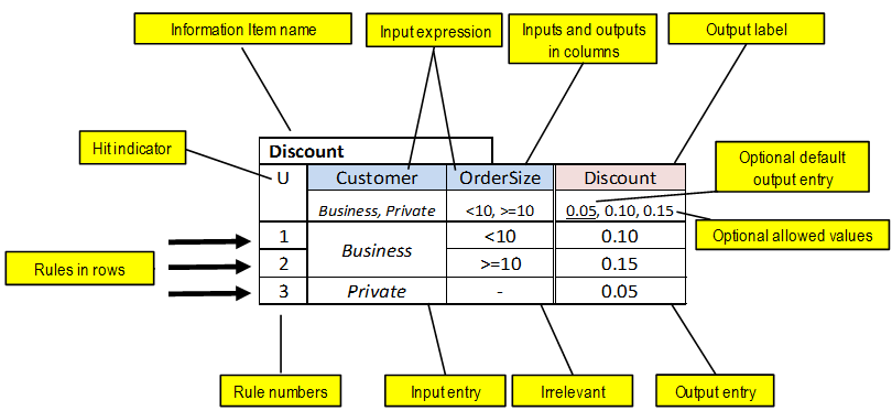 Behind each decision and BKM in the DRD is the decision logic, typically either a decision table or a literal expression, i.e., a text string in a defined expression language. Decision tables have been around in various forms for decades, and DMN imposes a number of constraints on their format. In the most common format, the top row of the table names the inputs and outputs, and each row below that defines a decision rule. Each column in the rule defines a condition applied to the input at the column heading. If all conditions for a rule are true, it is said to match and the output for the rule is selected as the table output value. For example, in the table below, if Customer = "Business" and OrderSize<10, then Discount=0.10. Decision tables are not only easy for BAs and business stakeholders to define and understand, but can be verfied for gaps and inconsistencies in one click.