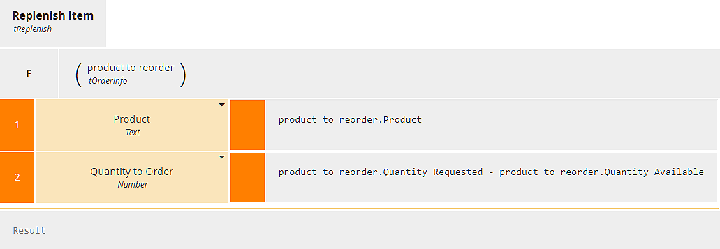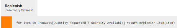 The following example from the Power FX documentation is a fair illustration of the difference in style from DMN and FEEL. Suppose we have input data Products, a table containing columns Product, Quantity Requested, and Quantity Available, and we want to generate a new table Replenish with columns Product and Quantity to Order, when the Quantity Requested exceeds the Quantity Available. The Power FX solution is a single expression with doubly-nested functions: