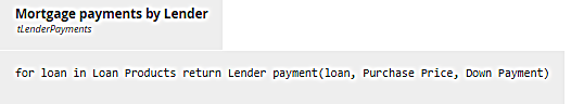 for [range variable] in [list variable] return [expression of range variable]where the range variable is simply a name meaning one item in the list - here one row of Loan Products, and the expression is a literal invocation of the BKM Lender payment. Note that the first argument is the range variable loan, again meaning a row of Loan Products, a structure with the five components shown above.
