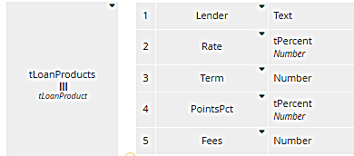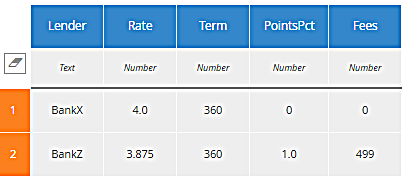 Wow, that's a mouthful! Yes, the formula is "well-known" in the sense that it's used all the time in mortgage lending, but do we expect a decision modeler to be able to enter it from memory, or even type it in correctly? Maybe not. Let's say this decision is used by a mortgage broker who is dealing with a number of lenders. BankY's data looks like this: