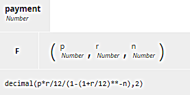 The name of the invoked BKM, payment, is at the top. Below that is the two-column table, the BKM parameter names on the left, and the mapping expression for each on the right. The boxed invocation is maybe easier for beginners to understand, but both forms of the invocation work the same way and give the same result on execution. For a 30 year loan of $300,000 at an annual rate of 4%, the payment is $1432.25.