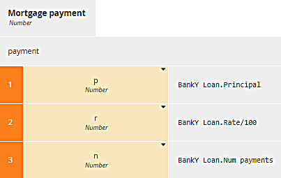The first way, called literal invocation, doesn't refer to the parameter names at all, just their order in the BKM definition. As you see above, p is the first parameter, r the second, and n the third. So for BankX's Mortgage payment we have this: