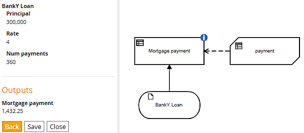 The decision Mortgage payment simply calculates the monthly payment based on those component values using the well-known amortization formula: